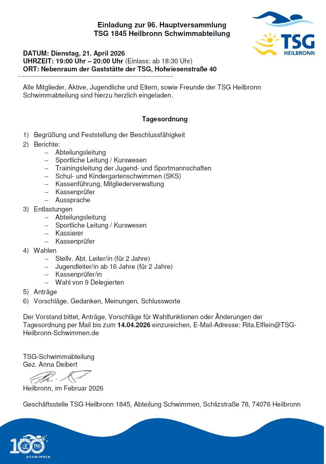 Einladung zur 96. Hauptversammlung der TSG 1984 Heilbronn Schwimmabteilung am 21. April 2026 von 19:00 Uhr bis 20:00 Uhr im Nebenraum der Gaststätte der TSG (Hofwiesenstraße 40).