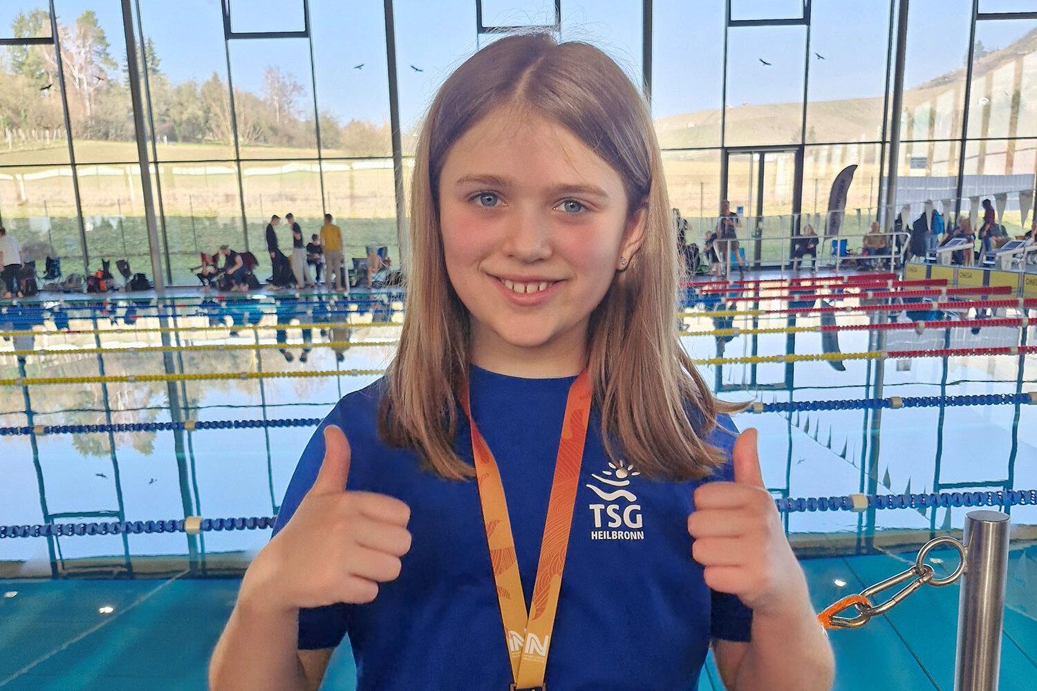 Maya Elflein (Jahrgang 2016) holte mit einer Zeit von 01:54,41 Sekunden Bronze über 100 m Brust.